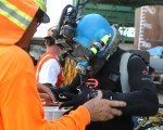 A diver prepares to perform an underwater inspection of the pilings of the Commodore Schuler F. Heim replacement Bridge. The old bridge is the last vertical-lift bridge that crosses the Cerritos Channel in the Port of Los Angeles.