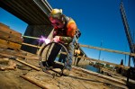 A welder works at the base of the Feather River Bridge. The 2,673 foot-long bridge connects the twin cities of Yuba City and Marysville. The structure, built in 1947, features steel place girder continuous spans with a reinforced concrete deck sitting atop a total of 23 concrete piers.