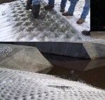 Repairs to a drainage structure after Tropical Storm Irene. Innovative use of grout and fabric to form ditch pavement. The erosion and undermining around this structure was enormous.