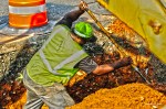 This photo of Georgia DOT maintenance worker Keith Monette was taken through an opening under a truck used to dump soil into a sinkhole on SR 3 Connector at SR 120 in Cobb County. Monette is preparing to use a Wacker Packer to compact soil around a repaired pipe.
