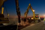 Demolition at Dusk. Crews tear down a structurally deficient bridge at I-44/161st E Avenue. The old structure was one of Tulsa’s most infamous “bad bridges,” with tarps placed under the beams to catch falling pieces of concrete prior to the replacement project in 2010.