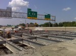 A section of a bridge being moved into place on the State Road 826/State Road 836 Interchange Reconstruction Project. There are 45 bridges in the project. The gantry was used to construct 4 of them because the confined space below precluded the use of cranes.