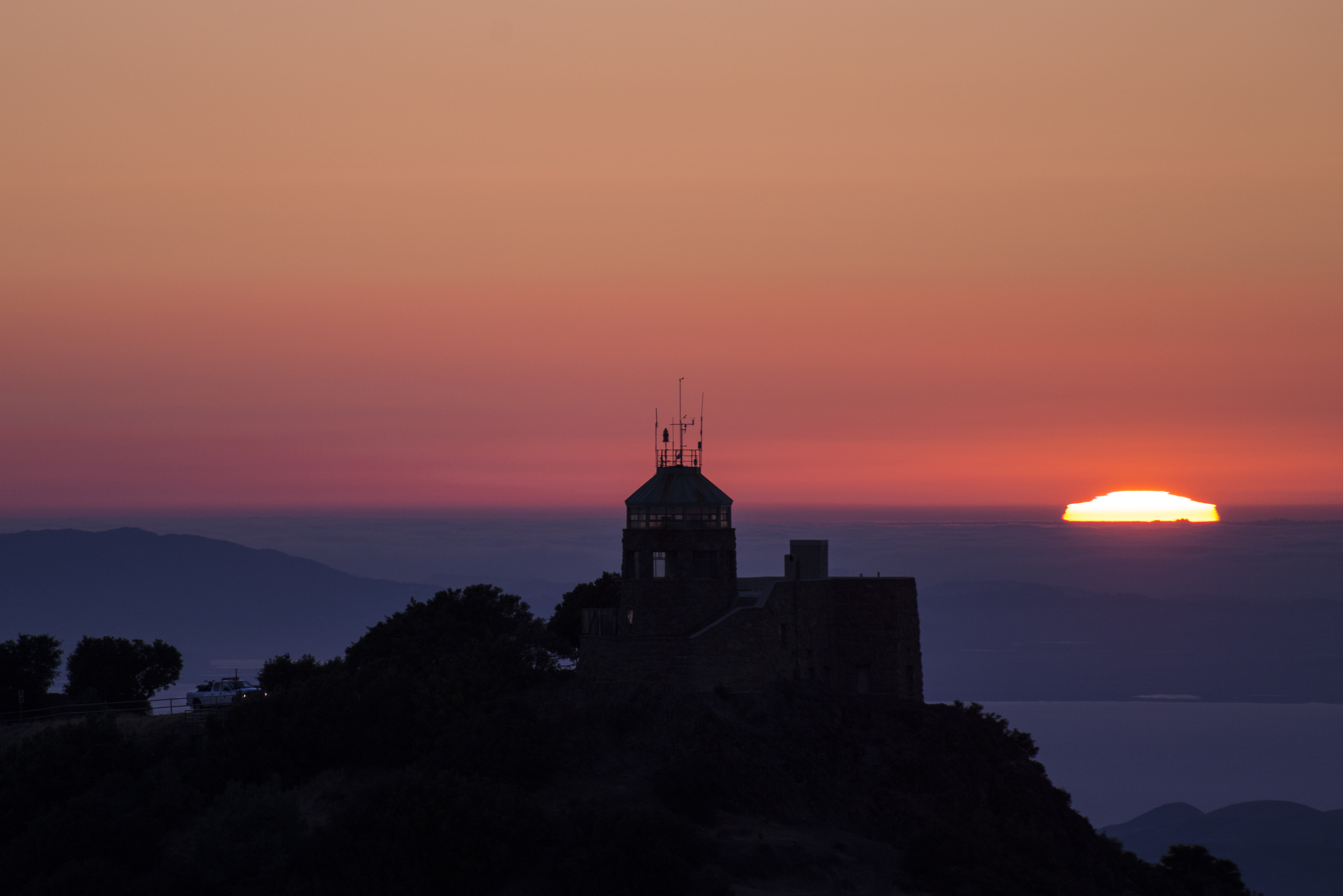 A State Park ranger stops in his truck at the top of Summit Road at sunset in Mount Diablo state park before locking up July 8th, 2013.