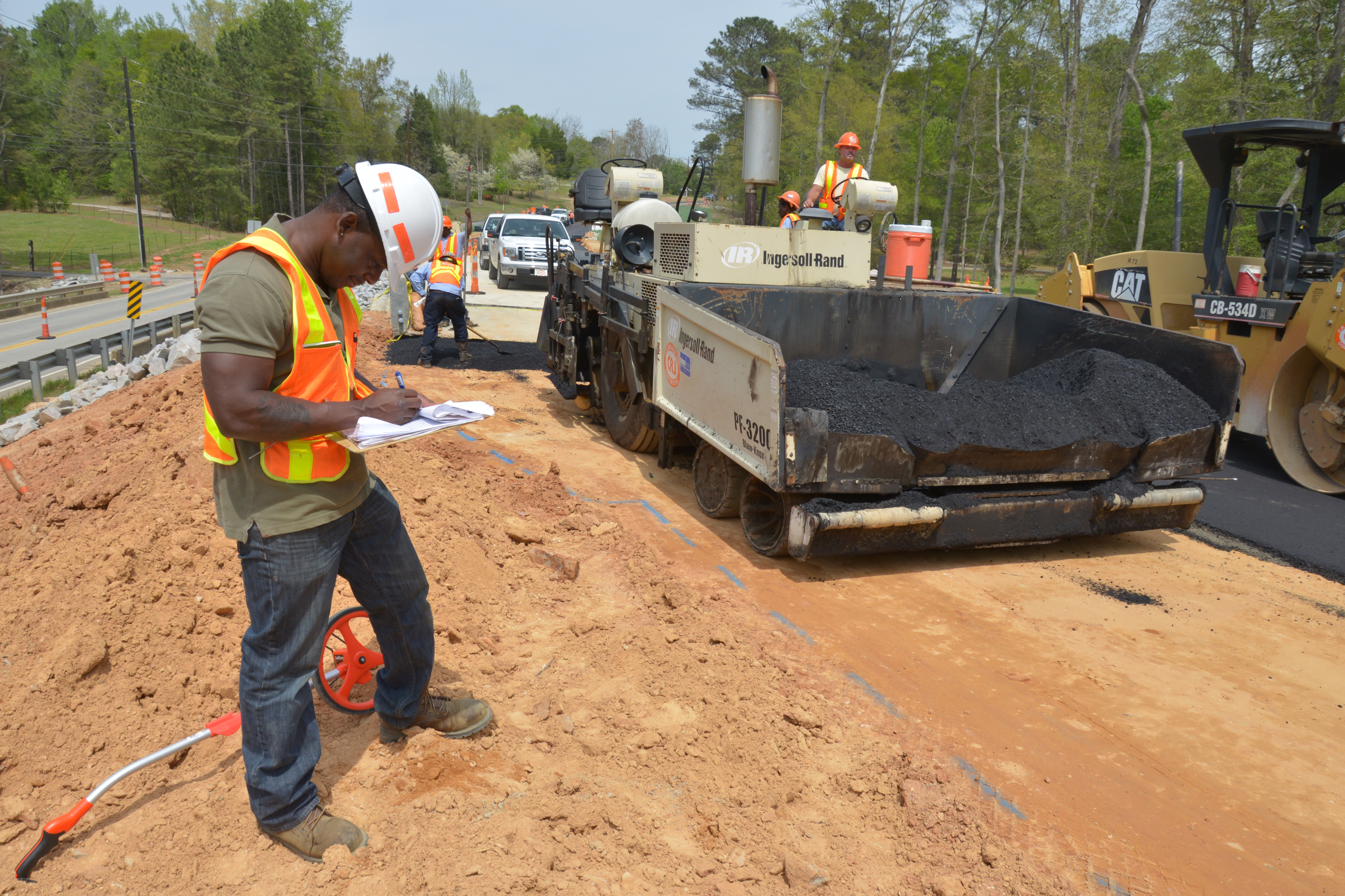 SCDOT Lexington Construction B employees manage and monitor the work of contractors as they replace a bridge and realign the roadway of a portion of Hope Ferry Road off U.S. 378 in Lexington County on April 11, 2014. Derrick Goodman was recording asphalt depths, loads of asphalt delivered, asphalt temperatures, etc. during the project. Also on the project is Allen Frierson.
