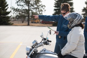 Jenifer Blumhagen is drving the new motor cycle course while Drivers License Examiner Brie Moore of Minot is being trained for new motorcycle testing course