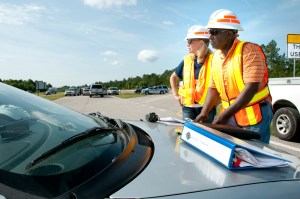 SCDOT employees Harriett Caldwell-Moore, left, and Clarence Blakely look over lane reversal plans as SCDOT employees put out cones and barricades to simulate closing exits from interestates as part of a hurricane lane-reversal drill on June 3, 2014.