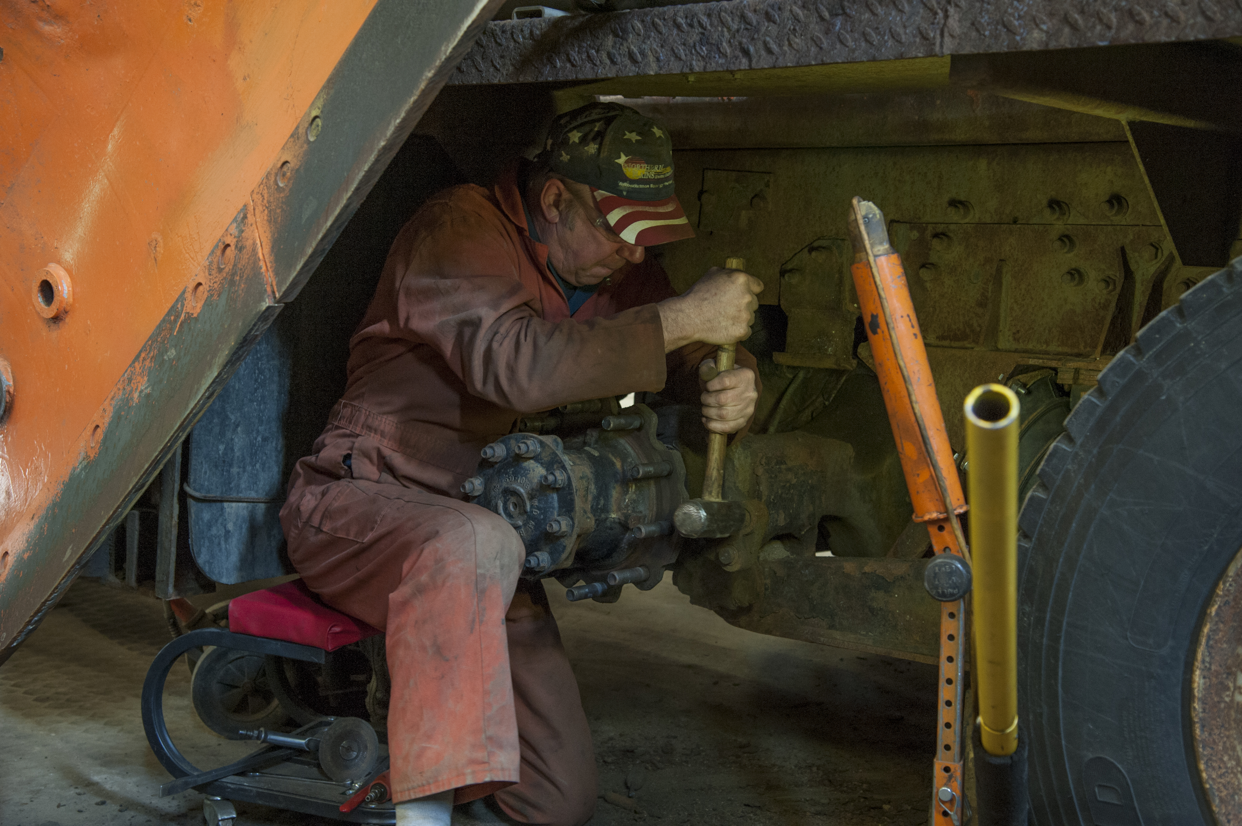 Lowell Spitzer working on a truck inside the Valley City District shop