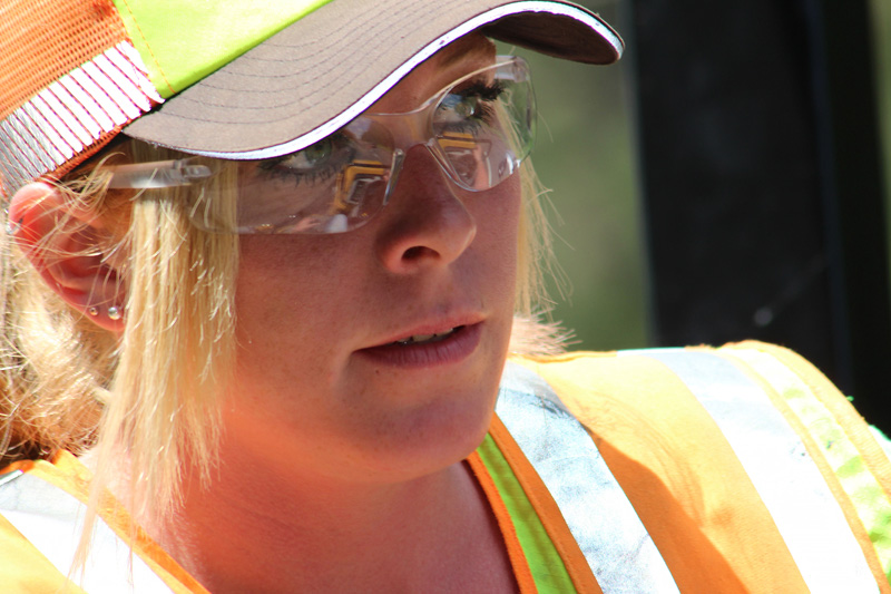 Shannon McIntyre, MnDOT transportation generalist, looks ahead as she drives a Caterpillar compactor over hot asphalt on the edge line along Interstate 35 near Sturgeon Lake, Minnesota.