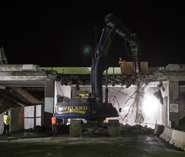 A large excavator fitted with a hydraulic hammer breaks down a section of concrete bridge on State Route Four in Antioch Ca. The bridge was demolished to make room for the widening of the highway and the addition of a light rail system.