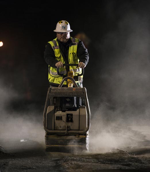 Unknown worker uses gravel compactor to slat ten gravel that was disturbed during a night time highway closure.
