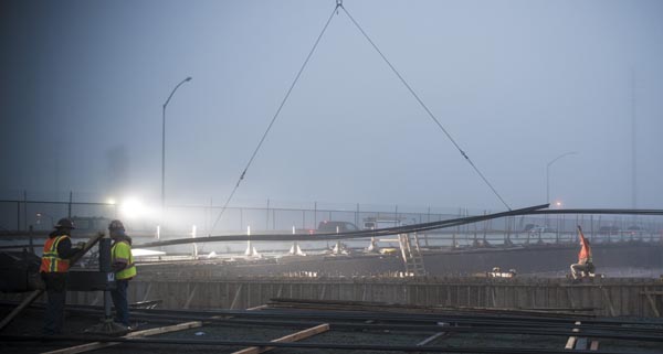 Workers install rebar on a foggy morning in Pittsburg CA at the Loveridge overpass.