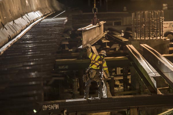 Workers install I-Beams for the construction of a new bridge over State Route 4 at the Contra Loma site.