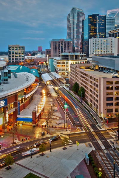 Evening travel on the CATS LYNX Blue line light rail system through Charlotte will currently take you for 9.6 miles. The Blue Line has 15 stations, with a ridership of between 14,000 and 15,000 daily. A recent extension of the successful LYNX Blue Line light rail service will bridge the city with the campus of UNC Charlotte.