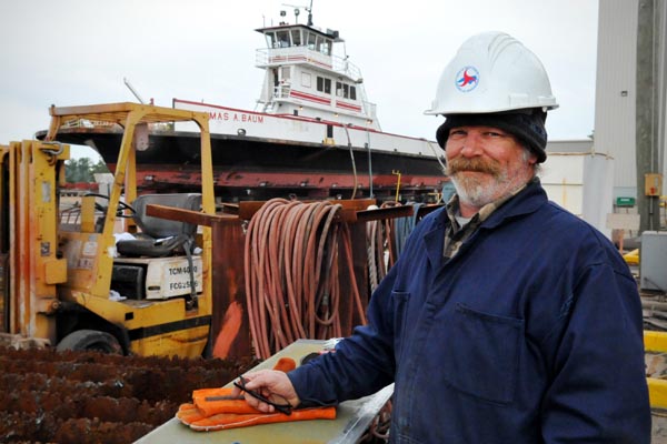 Tommy Blayden, a welder with the NCDOT Ferry Division, preps a section of a ferry’s hull plate. The plate will later be welded into place, thus, maintaining the sea worthiness of vessel and extending its future safe use.