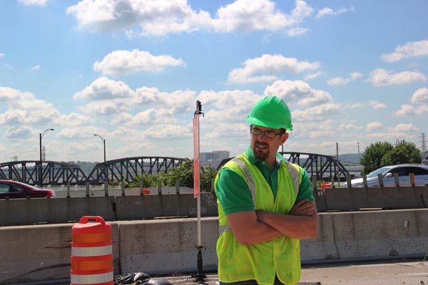 ODOT Transportation Engineer Josh Bowman is shown on the site of the Interstate 75 Modernization in Dayton, Ohio. Josh has played an integral role in all phases of the project to improve safety, decrease congestion, and provide much-needed updates to the more than 50-year-old highway serving the downtown area.