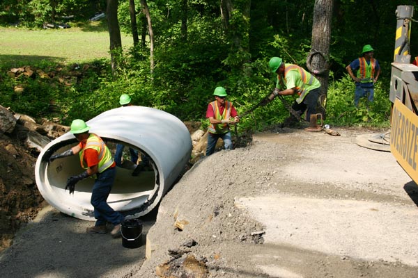State workers install an upgraded culvert on State Route 772 in Pike County, Ohio. The old culvert was too small to accommodate the water flow, resulting in roadway flooding during heavy rains. The new culvert also prepares the road for planned resurfacing.