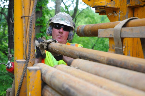 Standing above the Muskingum River on State Route 555 near Zanesville Ohio, Drilling Crew Chief Michael Lewis of the Office of Geotechnical Engineering unloads a drill rod in preparation for a soil sample on an upcoming bridge replacement project.